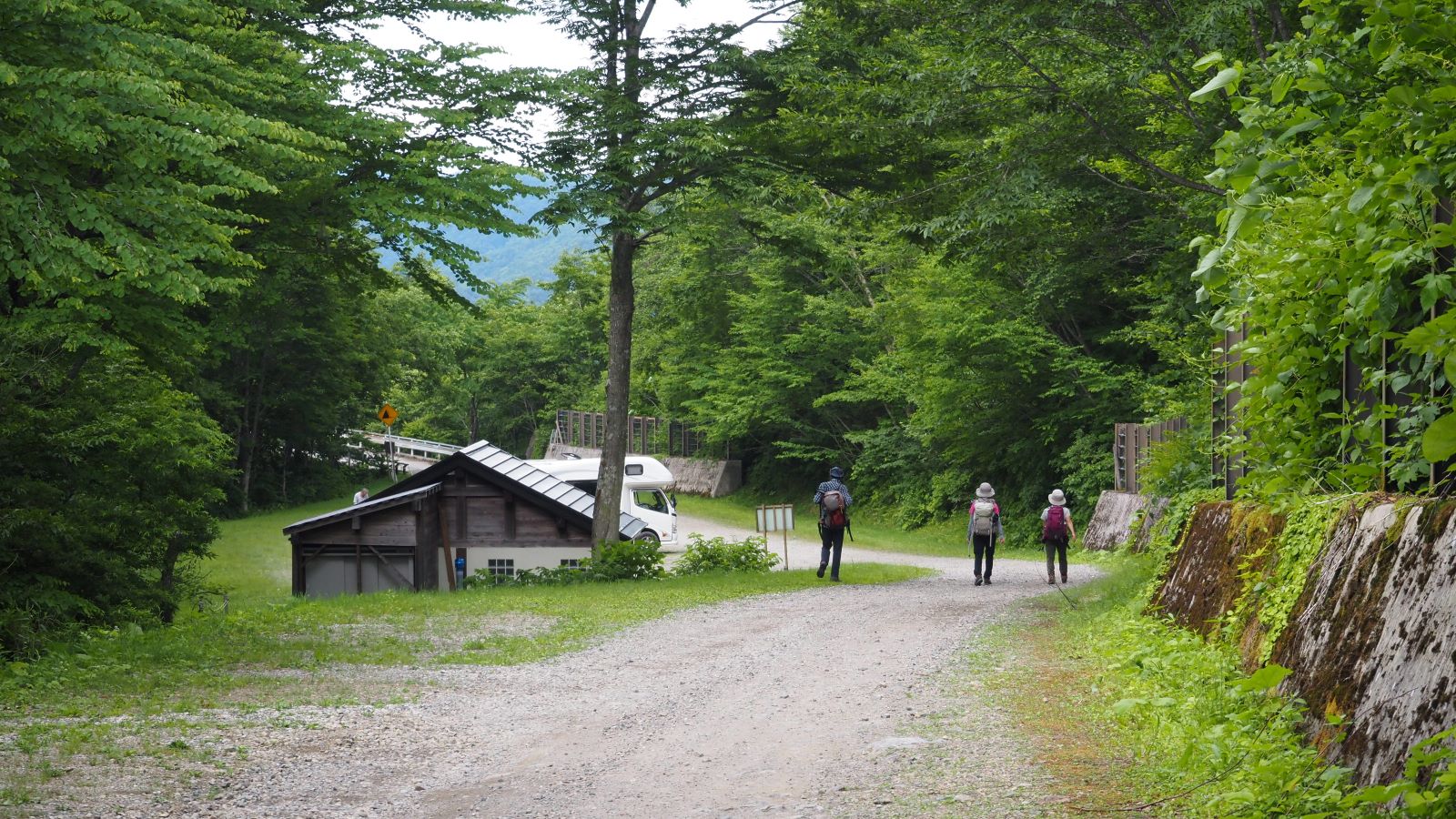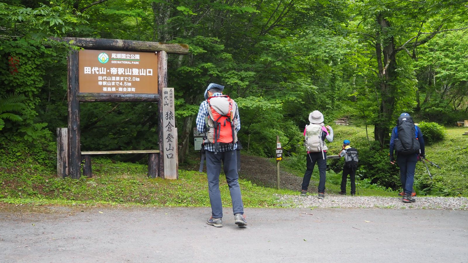 車道を歩いてまもなく猿倉登山口。登山口にある上の駐車場は満車。道路はこの先栃木県側へは車両通行止め。