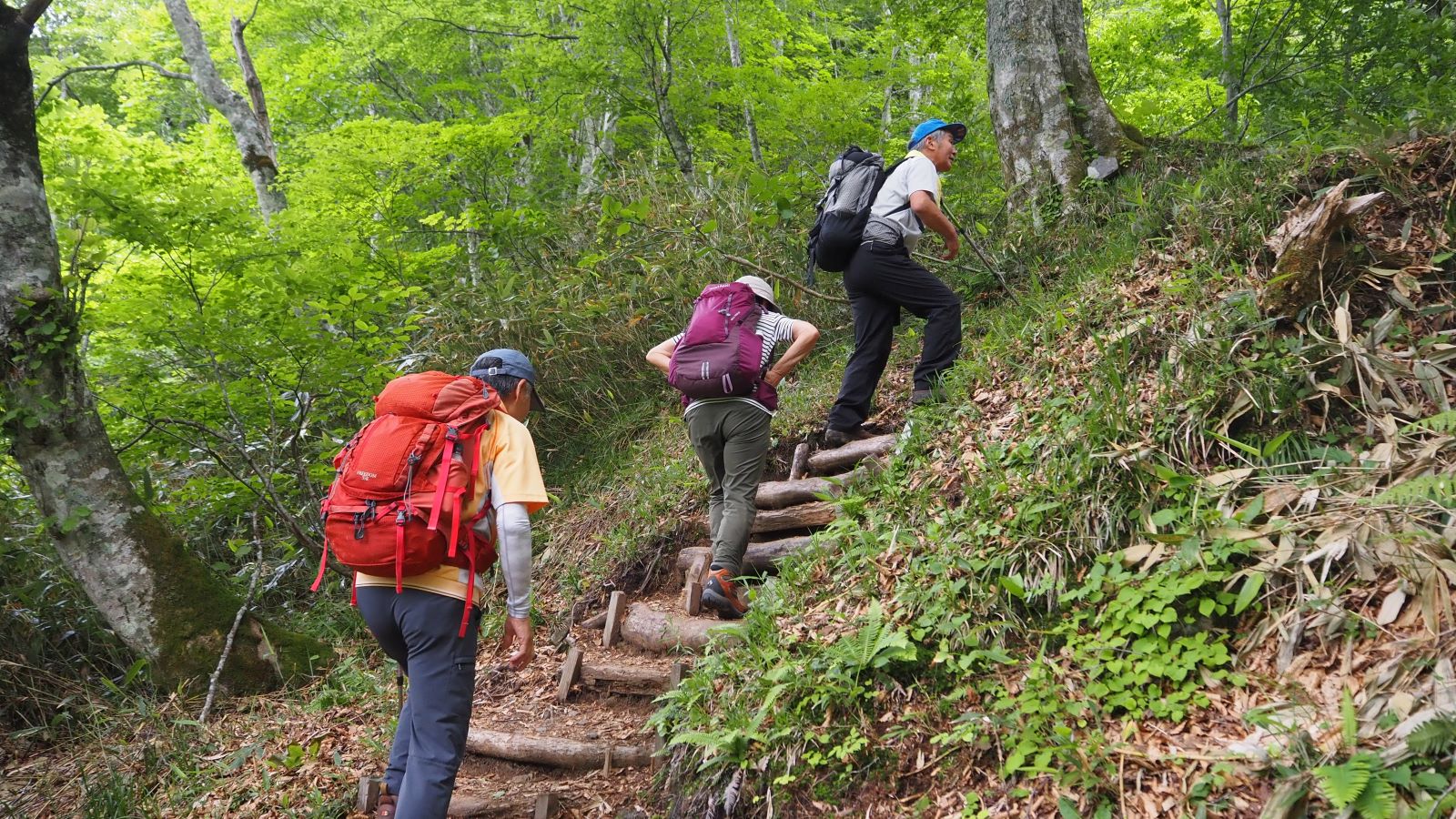 登山口から山上の湿原までの標高差は500m。ずっと、ずっとこんな階段が続いている。