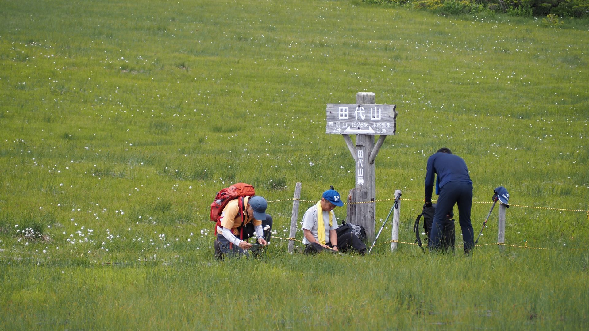 なぜか大草原のまん中に田代山の山頂標識。プリン山なので目立ったピークもなくどこが山頂でもいいのかもしれない。この山は上空から見るとプリンの形をしているのであって歩いていてもプリンの実感はない。