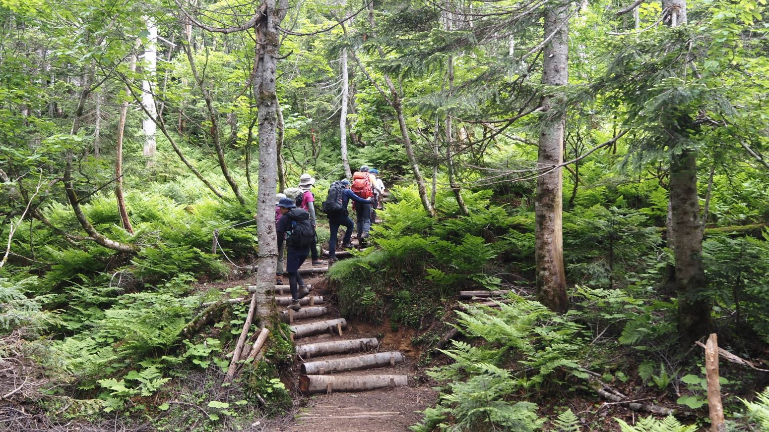 チョットだけ階段から解放される小田代。山上の湿原まではあと標高差100m。