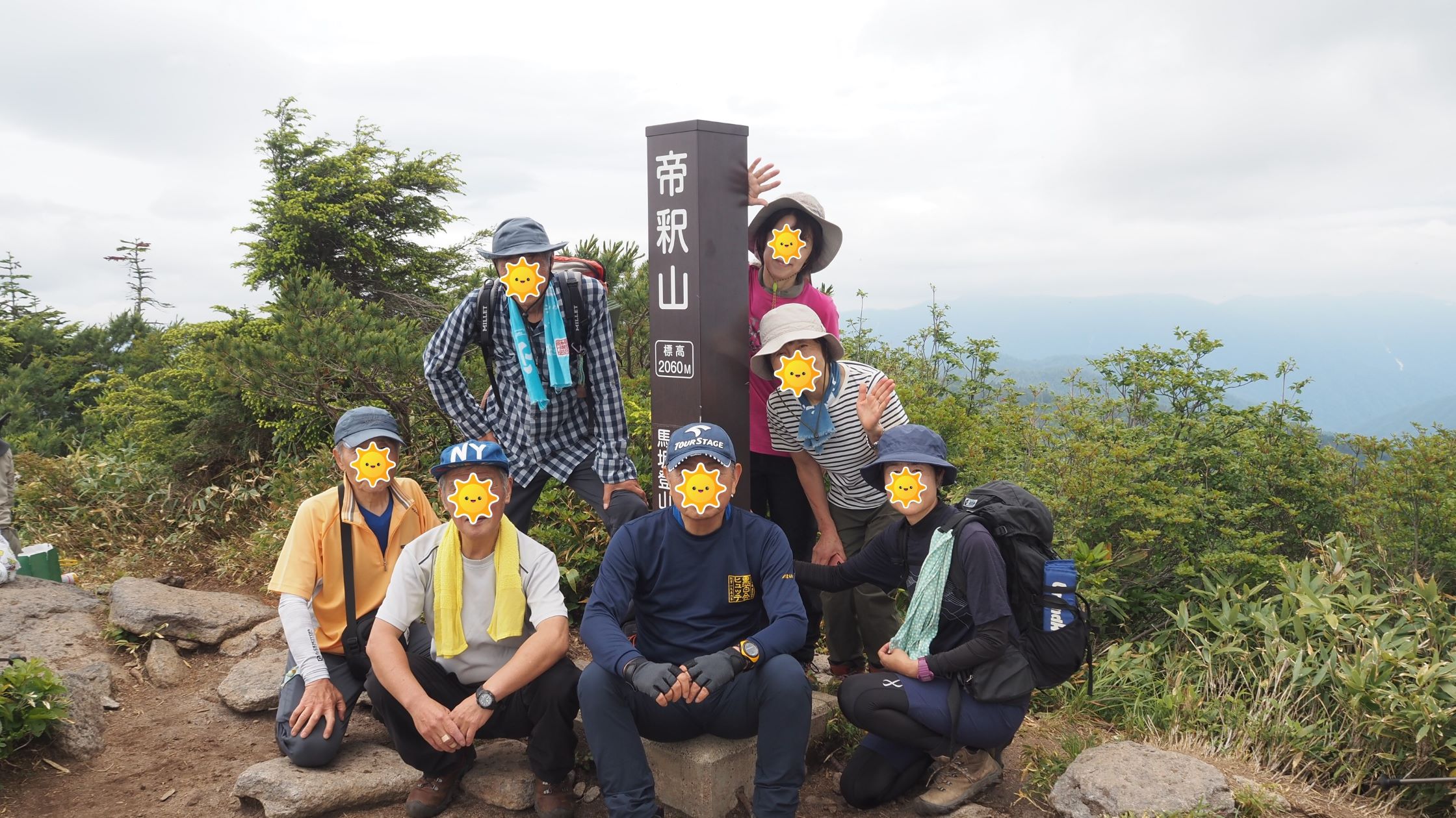 帝釈山山頂で登頂証明写真。木々がちょっと展望の邪魔になる。A氏によると30年前に比べて木が伸びたようだとのこと。周りの山々に雲がかかり始めてきたので長居をせずに来た道を戻る。