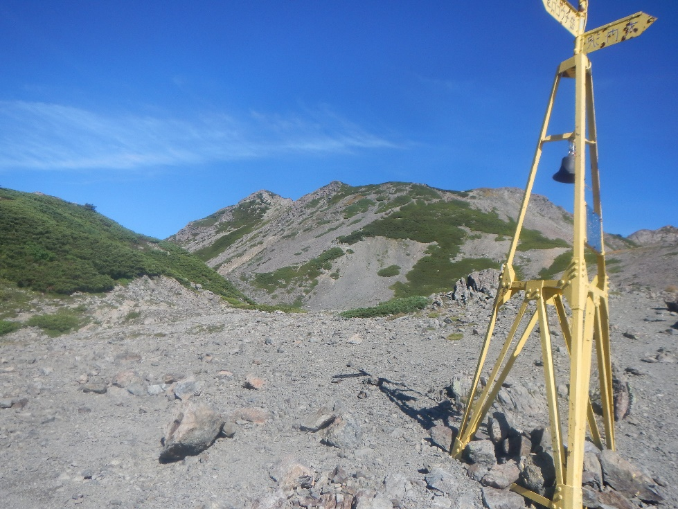天気は快晴。森林限界を越えると視界も開け、青空に吸い込まれるように上へと登っていく。鐘付きのやぐらがある大門沢下降点で長い登りも終わりとなり、ここからは稜線漫歩となる。