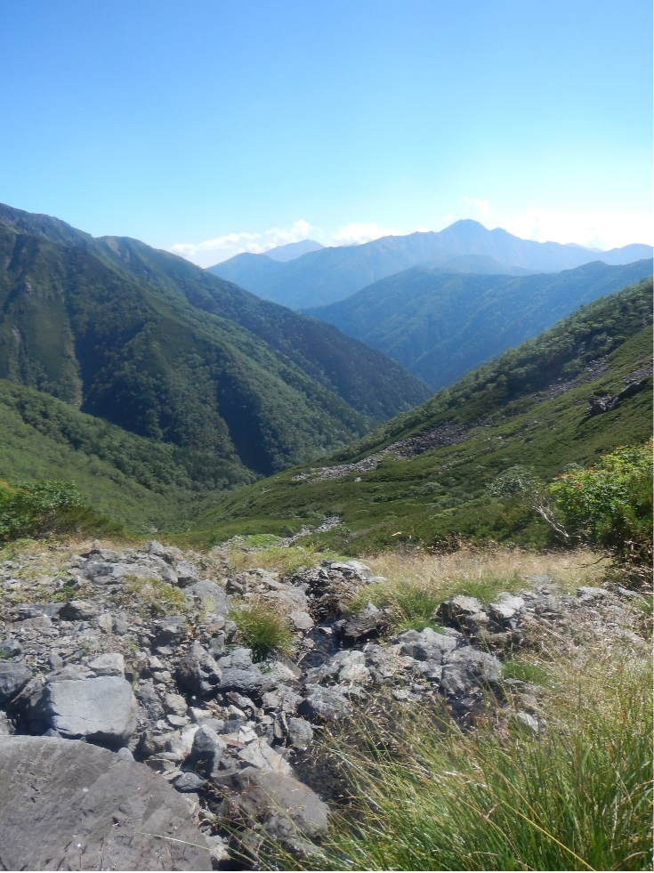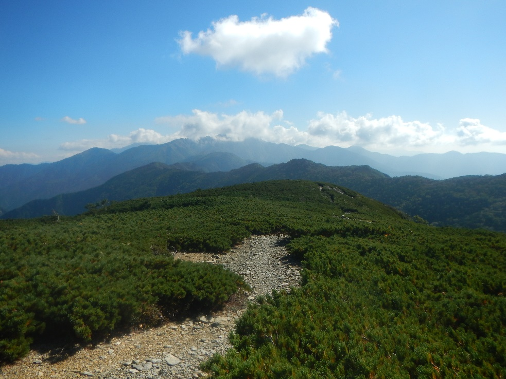 登山道は三国平で仙塩尾根に合わさり、熊ノ平小屋に下りていく。