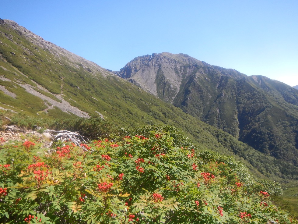 <源流から見た西農鳥岳。ナナカマドが色づいていた>