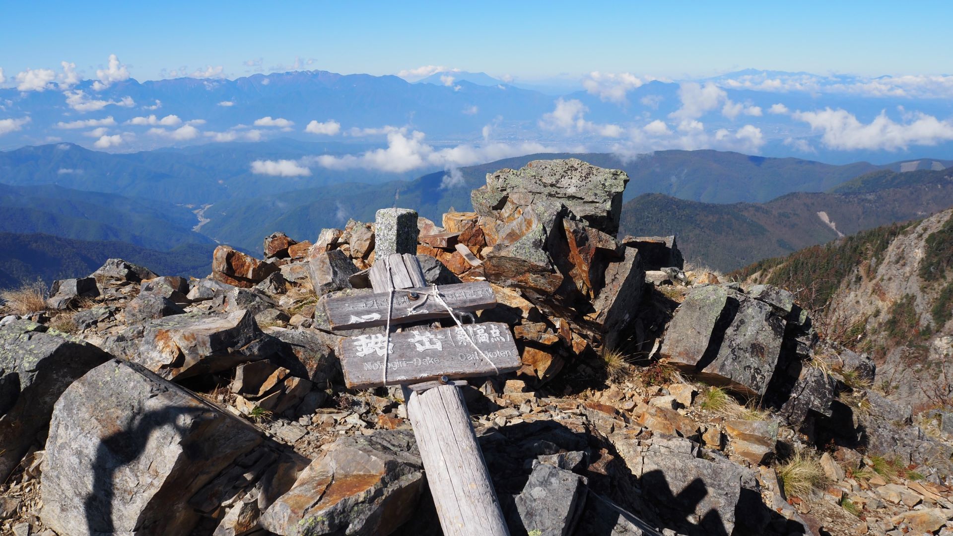 山頂からの大展望。甲斐駒、鳳凰、富士山は一直線上にあるのだ。
