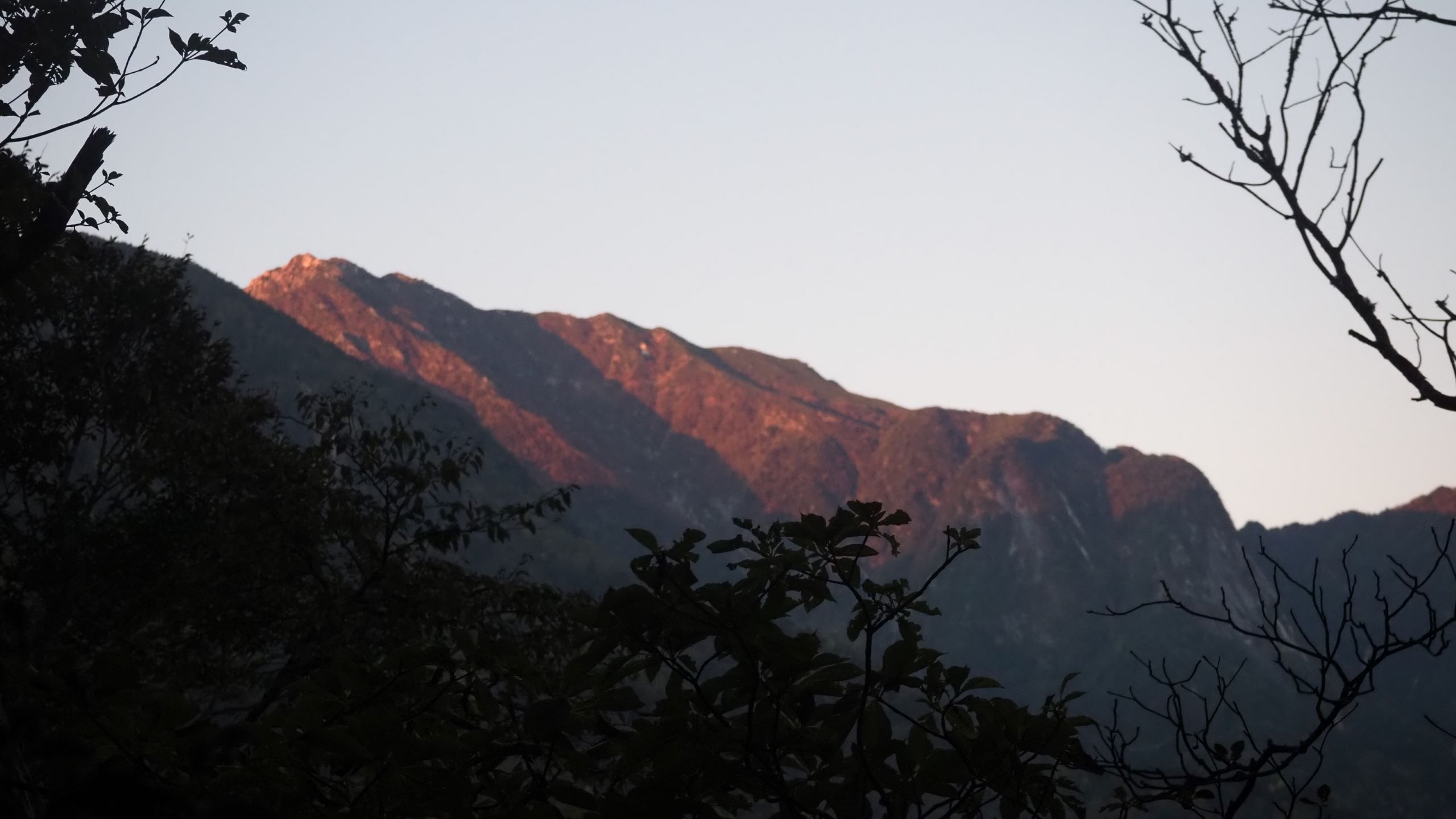 歩き始めて1時間半。ようやく山頂に日があたり始めた。