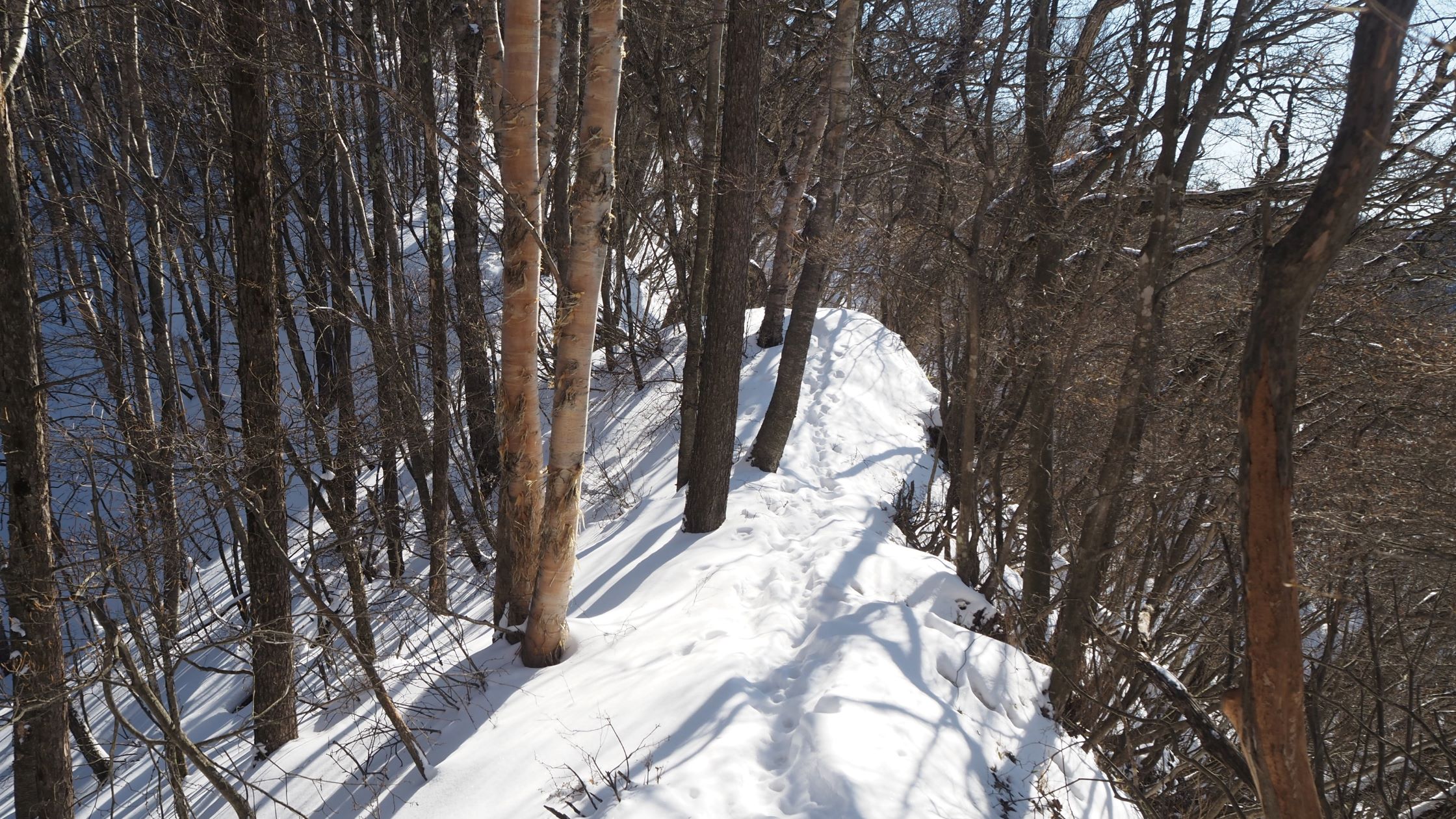 船ヶ鼻山から薬師岳に向かう。雪上に2-3日前のものと思われる足跡が2つほどあったが誰にも会わない。あまり展望のない稜線が続く。