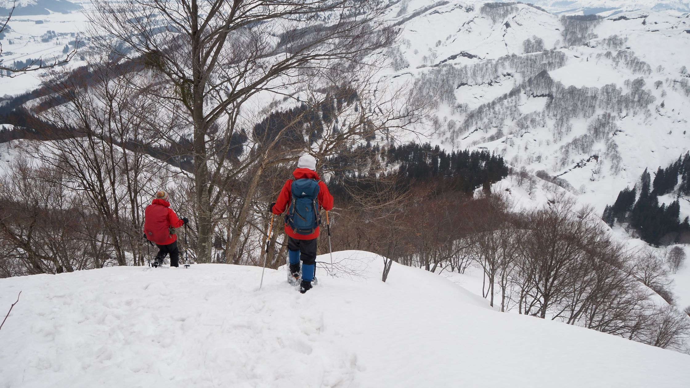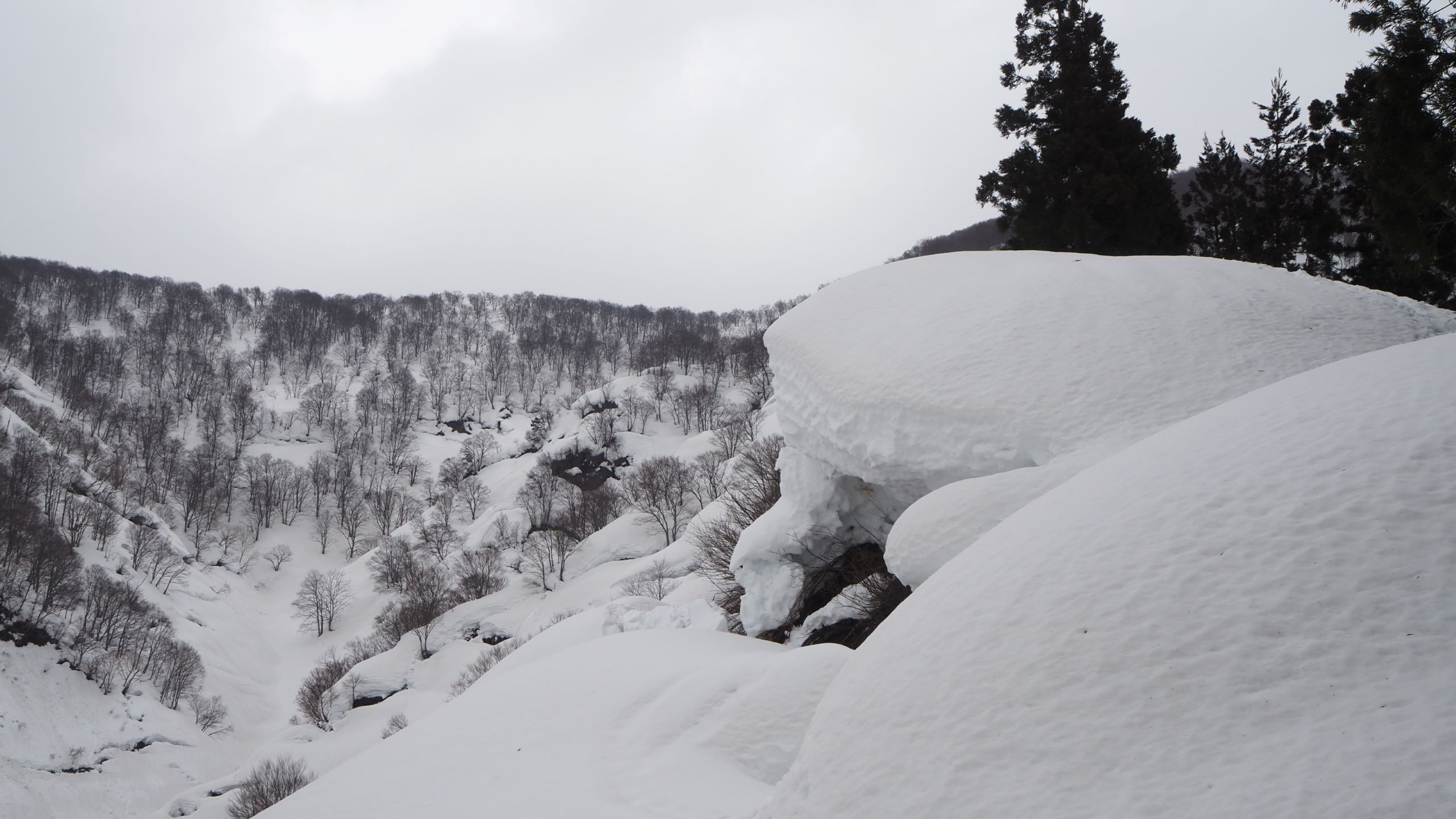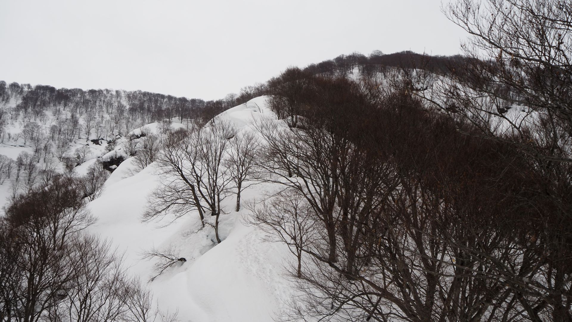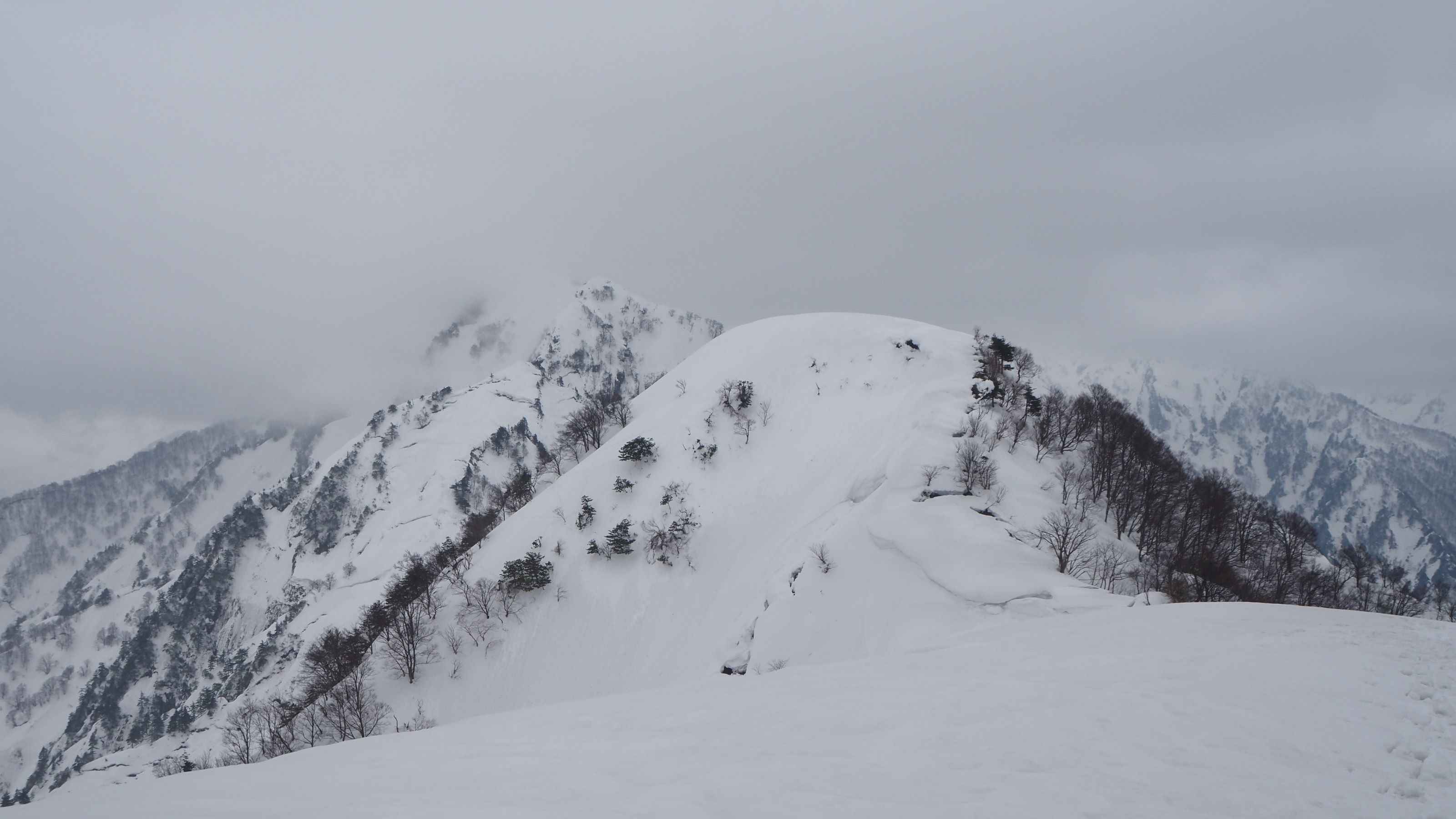 尾根上の積雪は3-4m。前日のトレースが残っているのでラッセル無し。