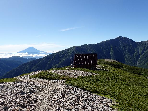 広い山頂からは遮るものがない。これでもか、というくらい大きく見える荒川三山、そびえ立つ塩見岳の奥には仙丈岳も見える。そして富士山が優美な姿を現していた。