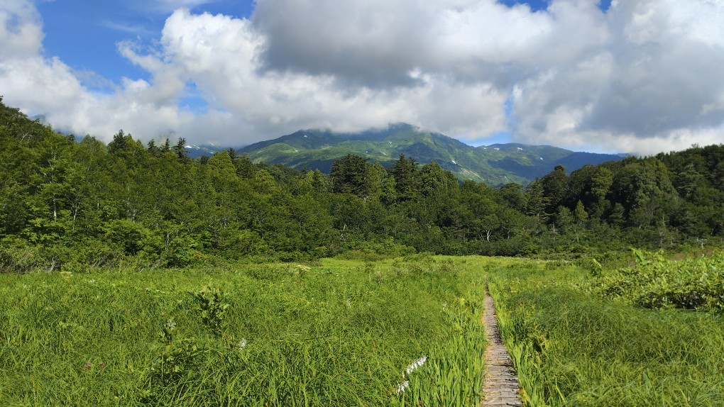 照葉の池の湿原と朝日岳。山も雨不足のようで湿原も乾きぎみ。