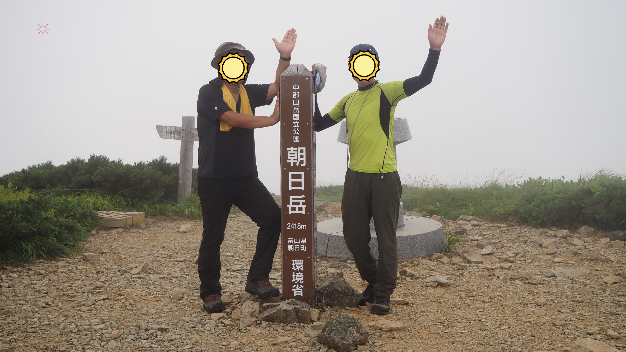 吹上のコルから1時間ほど登って感動の朝日岳山頂。でもガスって真っ白で何も見えない。