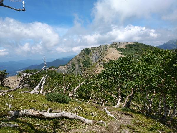 山頂を後にし、北俣岳分岐を過ぎると仙塩尾根となる。稜線直下のザレた急斜面ははい松帯にトラバース道が付けられている。下り切り、ダケカンバの草原を過ぎると北荒川岳の山頂だ。大好きな山頂。ここから見る塩見岳は圧巻の眺めだが、ガスはすっきりと晴れてくれない。