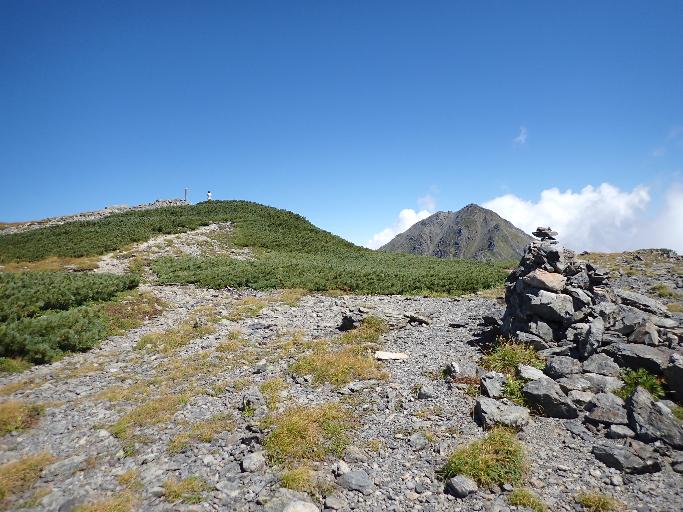 北岳山荘まで下ってくると雲が湧き始める。中白根山を越えて間ノ岳に着くころには高い山々は雲に覆われてしまい、間ノ岳からの展望は得られなかった。