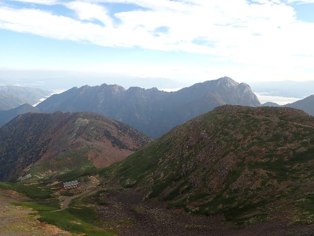 「仙丈ヶ岳からの甲斐駒ヶ岳~鋸岳。真下に仙丈小屋が見える」