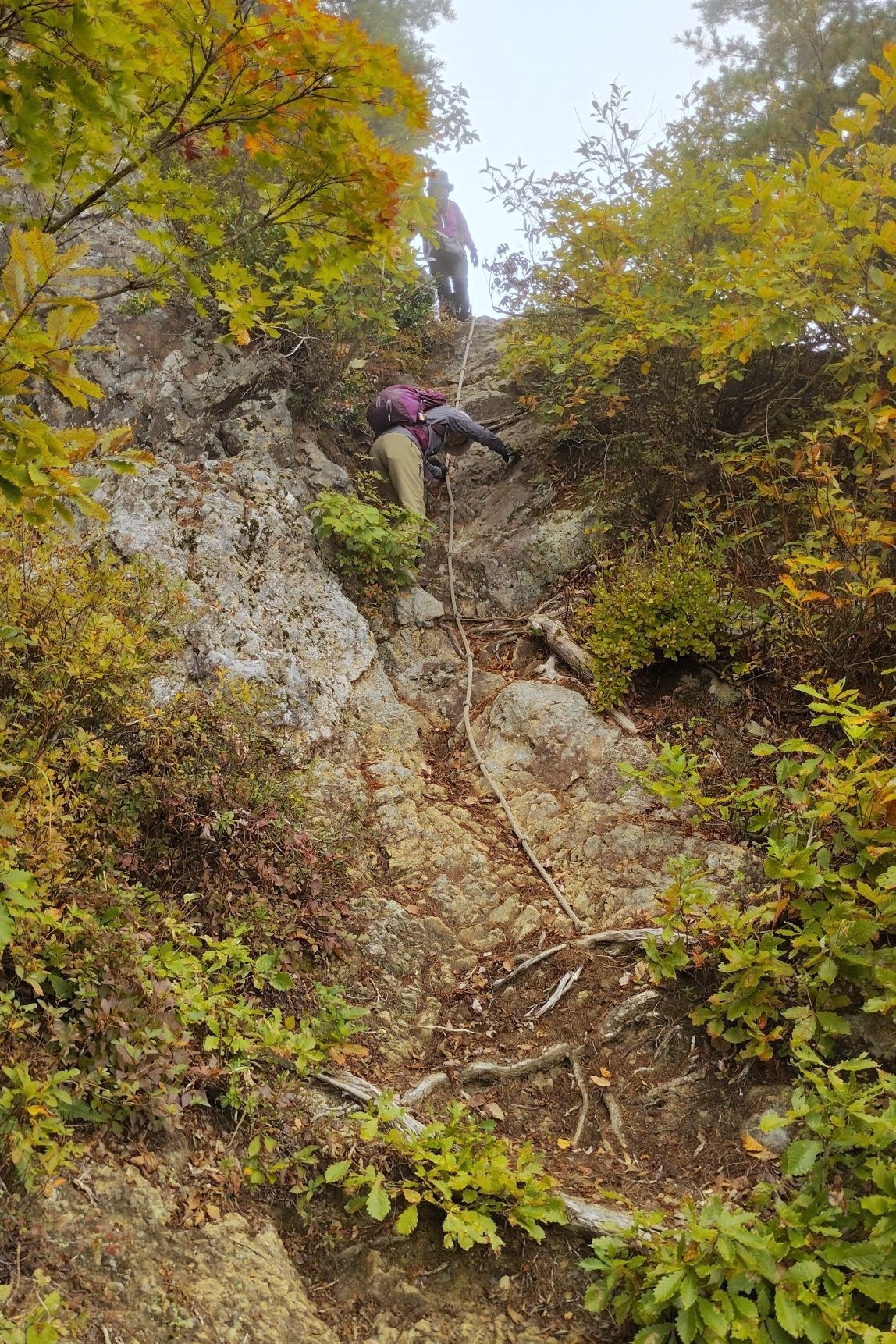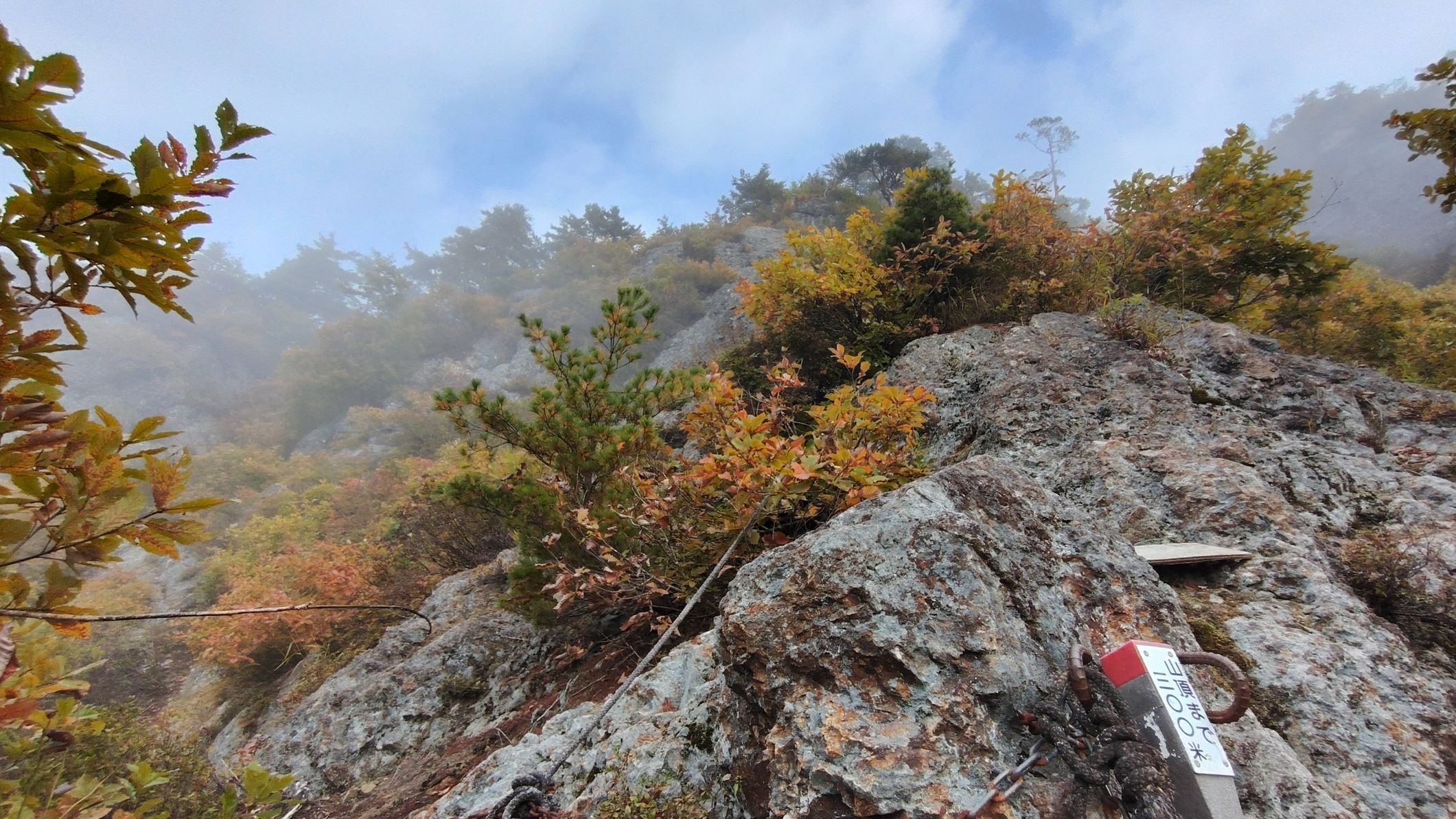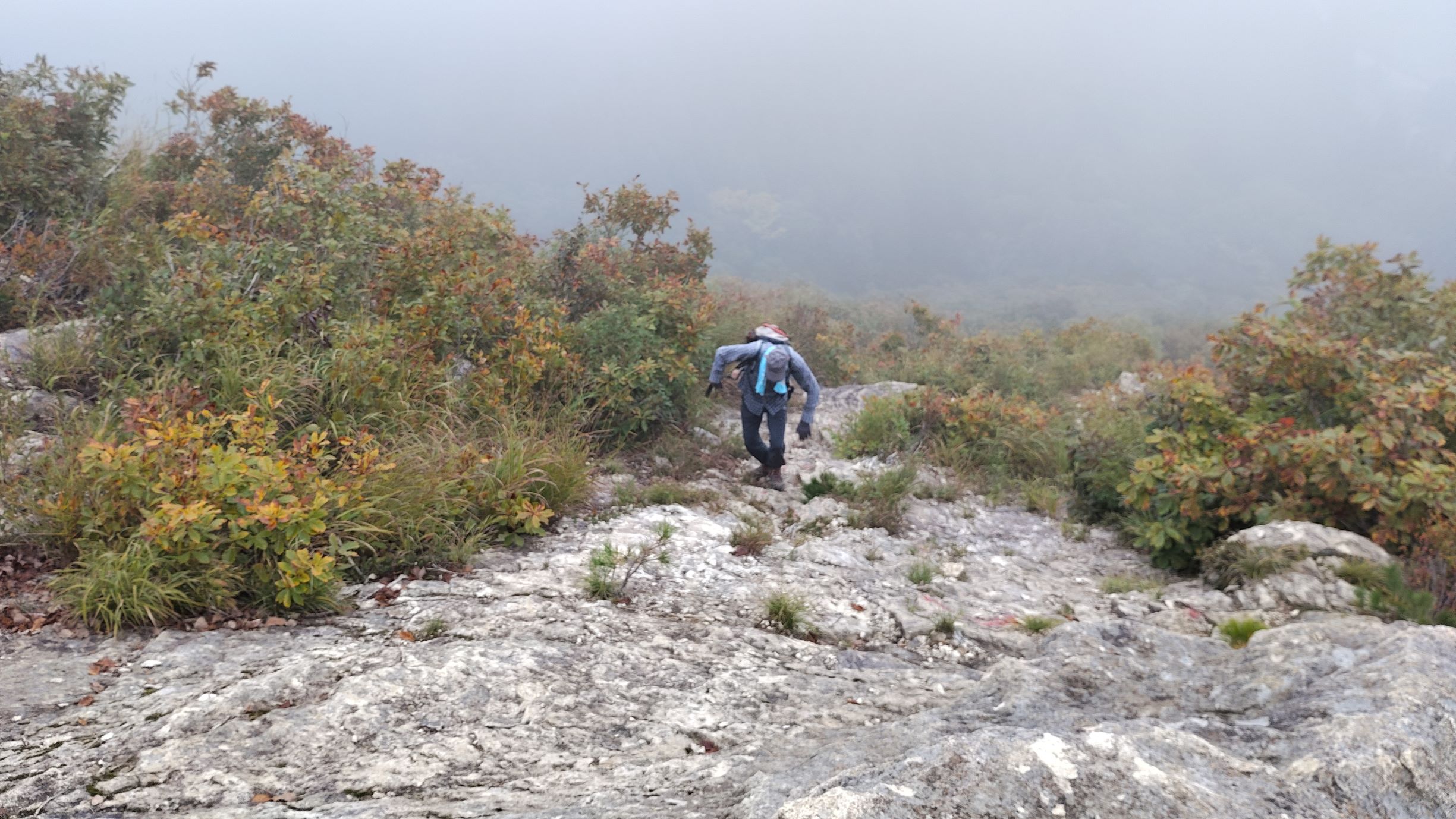 樹林帯を抜けて最初の岩場を登る。ガスで山頂も下界も見えない。