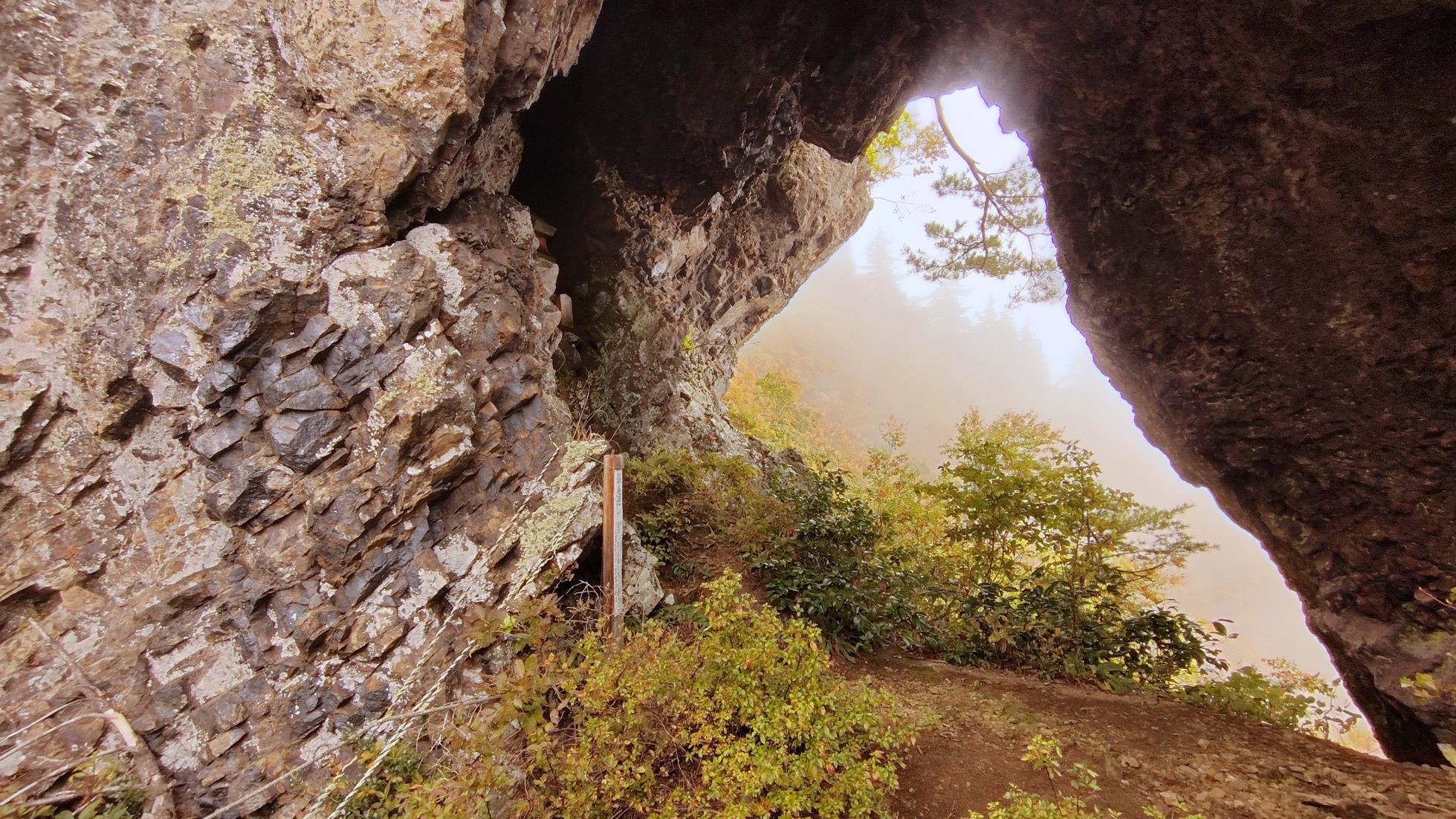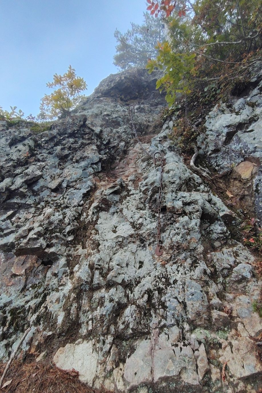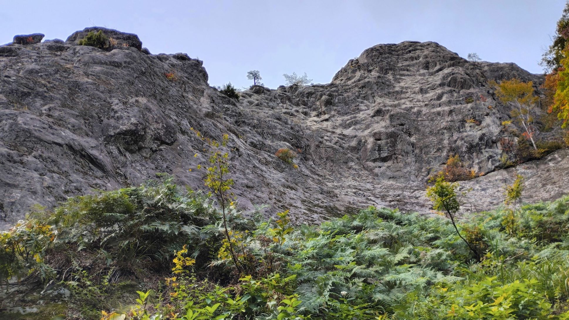 クマのフンがボトボト落ちている道をしばらく行くと目の前にいきなり岩壁が現れる。