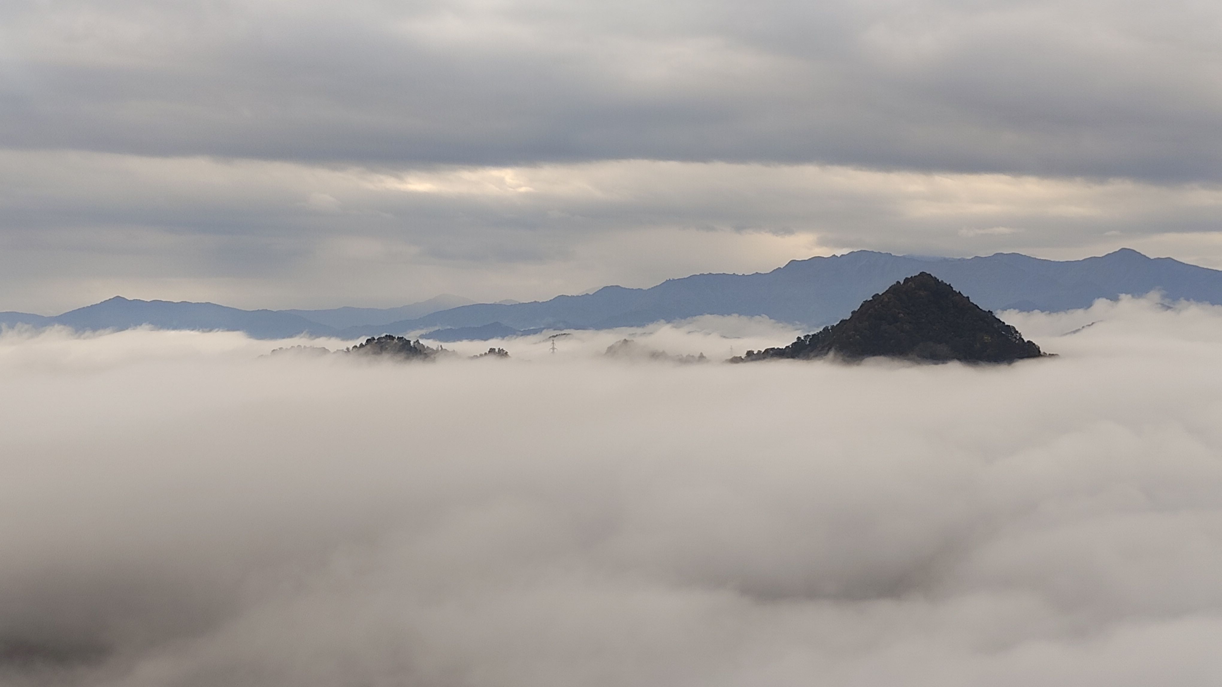 山頂付近はガスがなく一面の雲海だった。三角形の山は只見川対岸の芝倉山