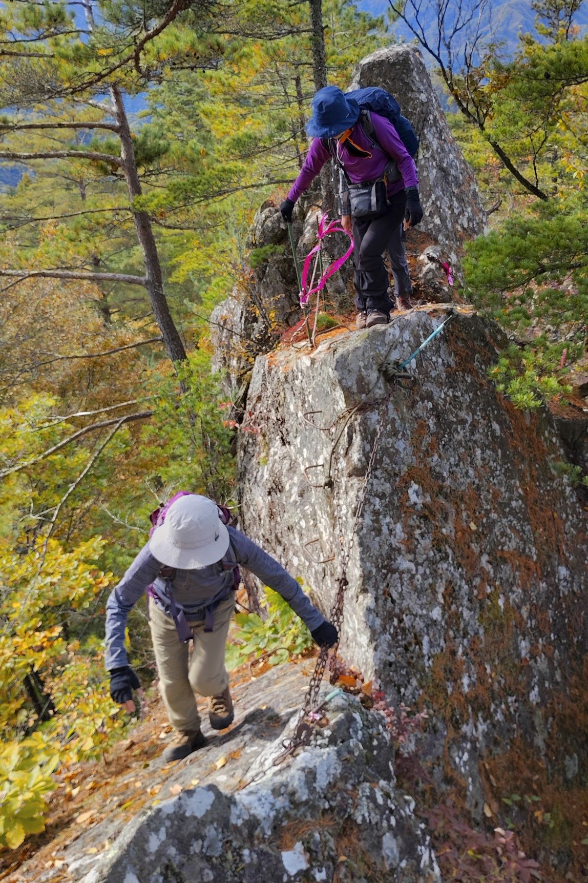 厳しい岩山ですが地元の人たちが岩を削って足場を作り、クサリやロープを取付けて登山道ができました。『会津のマッターホルン』は田部井淳子氏の命名とのこと。(只見町のパンフより)