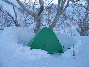 テン場は下ノ樺のあたりが最適だそうだ。行く尾根の中でダケカンバが林立している場所がある、そこら辺で幕営を…と考えながら歩いていたら、ダケカンバの林の中に前日幕営したのだろうか、ちょうどテントを張る大きさにブロックが積んであるのではないか。これはラッキーとばかりに自分たちもテントを張り、空身で山頂をピストンすることにする。時間は押し迫っていたが、チャンスを最大限に生かしたかった