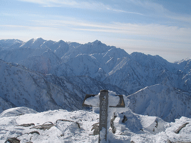 尾根を乗っ越すと主稜線で、目の前にはドデ〜ンと大展望が広がった。風は強いが、歩けないことはない。冬の北アルプスではそよ風の部類になるのだろう。15時前に山頂着。360度の展望、まだ青空も広がっている。剱岳も目の前だ。強引に登ってきて良かった。この時季、そして、この標高、もう二度と登れないかもしれないもの。