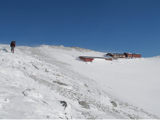 八方尾根スキー場からスタートする。ゴンドラからリフトを2回乗り継ぎ、八方池山荘に行く。ここで標高1850m弱、時間は10時を回っていた。ルートはほぼ夏道沿いなのだろう。山頂まで標高差1000mほど、コースタイムにして4時間くらいだろうか。第3ケルンまでは広い尾根の雪原が続く。翌日の荒天のことを考えて、念のため赤ポールを数箇所差しながら登る。スキー場を抜けると人がぐっと減り、山に登っていくパーティーは2、3組ほど。思っていたよりもずっと少なかった。天気はこれ以上ないくらいの晴天、風も無風に近く、とても厳冬期とは思えない。