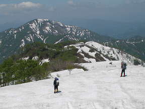 5/21 快晴になった。ゆっくりと朝寝をし、出発する。縦走路は北股岳の登り、扇の地神あたりに雪が残っているくらいだった。どこのルートを下るかでもめたが、西俣ノ峰ルートを通ったことがないメンバーがいて、そちらを下ることにする(私はもうヤブこぎをしたくないので、梶川峰を下ろうと言い張ったのだが、簡単に却下された)。