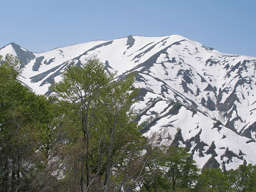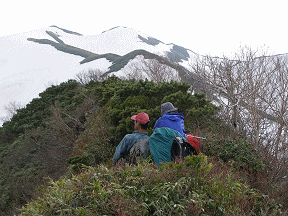 地神北峰から縦走路を少し入ったところで、西俣ノ峰に続く尾根に入る。最初は大きなカールだが、雪の急斜面を下ると尾根上が顕著にわかるようになる。天気は申し分のない快晴で迷いようがない。左手には東俣川を挟んでの朳差岳がド迫力で迫っているし、真正面の行く手には枯松山がピラミダルでそそり立っている。雪はまったりと付いていて歩きやすいし、展望もよい!と反対したことなど忘れ、感激しながら下る。途中、多少のヤブこぎがあったが、ほとんど雪の上を快適に歩き、西俣ノ峰着。快晴、大展望の中の昼食、最高のひと時だった。西俣ノ峰から稜線を右方向にはずれる。少し下ると雪もなくなり、夏道になる。西俣ノ峰までは大分登られているらしく、しっかりとした道だ。途中で山菜なんかを採る余裕もあり、1ピッチで梅皮花荘着。飯豊山荘に続く林道から、山スキーヤーがスキーを担いで続々と戻ってきている。山スキー日和だったろう。