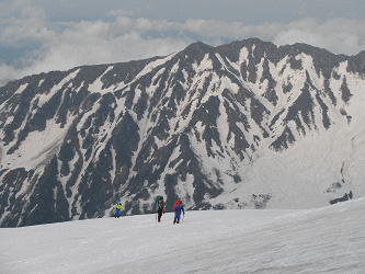 6ピッチ、7時間半も歩いたところで、幕営適地といわれる雪の上に出た。ダイグラ尾根のノコギリ歯が真近に見える。行く手には雪の急斜面が迫っている。幕営するにはここしかないだろう。時間は15時前…どうしよう。雪上の幕営+水作り+翌日の行動<<<小屋泊+水場+翌日の余裕ある行動、比べれば後者のほうがいいに決まっている。重い腰をあげて、200m強の雪の急斜面を登る。これからは雪の上だから、距離も稼げるだろう……甘かった。よりすごい這い松の混じったヤブこぎが待っていた。それにプラス、背より高い根曲がり竹の林も通過していく…這い松で振られ、根曲がり竹で滑り、疲れと焦りのイライラ感がピークに達し、爆発寸前のところで、烏帽子岳から伸びる雪渓に出られた。温身平からすでに9時間は経っていた。