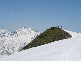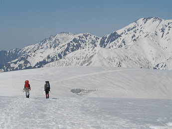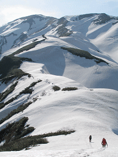 5/4 今日も快晴。雪がクラストしているので、アイゼンを付けて歩き出す。小沢岳へは500mほどの登りとなる。途中アイゼンを外し、三ツ石山、三番手山、四番手山と越え、小沢岳に着く。下津川岳から来た先客がいた。そこで、前日あった三国川の転落事故を聞く。私たちが予定している下山ルートだ。今年は残雪が多く、沢筋の道はトラバースがきついらしい。入山を丹後山からではなく、ネコブ山からに変更したパーティーが多いそうだ。なんて聞けば、3人の意見はすぐにまとまった。下山ルートをネコブ山経由にしようとね。ネコブ山も行ったことがないので、ラッキーでさえあった。携帯から会員に迷惑電話をかけまくったり、写真を撮ったり大休止。奥利根源流…大きな大きなカールを描き、平ケ岳へとつながっている。やはり歩いてみたい、いつかはね。