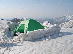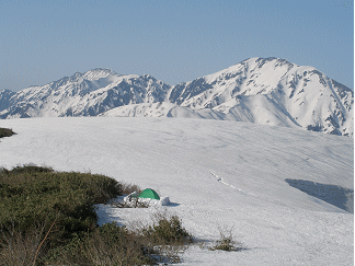 牛ケ岳からはすぐに急降下する。ここでテントを張るパーティーが2組いるみたいだ。私たちは当初からの目的地、永松岳と三ツ石岳の鞍部を目指す。デンと横たわっている下津川山と隣に尖がっている小沢岳が大きく見える。三ツ石山は案外近そうに見え、楽勝!なんて思っていたら、尾根が細くなりヤブが出始めた。重い荷を担いでのヤブこぎは辛いの一言。なんで分水嶺でヤブこぎなの?それも今年は雪が多いはずなのに?。それに三ツ石山がだんだん遠くなっていくではないか。ヤブと雪とを往来し、永松岳に着く。ここから400m下りたところが今日のテン場。笹ヤブを一気に転びながら下り、なんとか1450m地点に到着した。傾きかけた日差しの中テントを張り、乾杯。夜は満天の星…だったらしい。