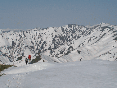 5/5 やはり晴れ。ゆっくりと起床し、のんびりする。2パーティーがすでに下山していった。桑ノ木山からの尾根は、たおやかな起伏で伸びている。雪上のトレースはバッチリ付いている。正面が中ノ岳から八海山に変わる頃から雪が少なくなり、雪のない尾根上を行くことになる。が、赤テープがしっかり付いている。人気の山なのだろう。プラ靴での雪のない尾根上は辛い、疲れも手伝ってダラダラと惰性で歩く…。