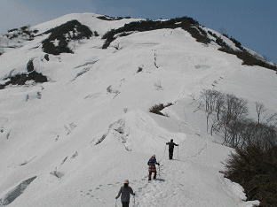 早朝、新潟発。総勢10人の参加となる。2日前までは荒天の予報だったが、前日になり晴れに変わる。毛渡沢の橋に車を止め、平標新道への林道に入る。高速道路をくぐった所で林道から右に分かれ残雪の針葉樹の中を行く。林道は奥まで除雪されているようだった。今春、遭難事故が相次いだからだろうか。