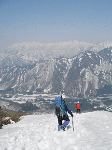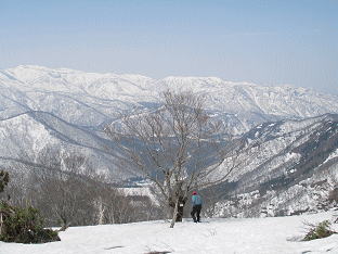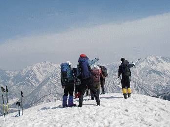 棒立山頂でお昼。タカマタギ同様、展望が素晴らしい。山頂は地が出ていたので、そこで宴会となる。太陽の光の中でのひと時、最高の時間だ。記念撮影して、下山。雪の下山は楽しい。半分滑りながら、走りながら、あっという間に松川分岐だ。晴天の中、すぐに下るのはもったいなく、ここでまた大休止。でも、十分明るいうちに車に到着した。日が長くなってきたんだなあと実感。残雪を満喫でき、大いに楽しめる季節、大好きな季節の到来だ!!
