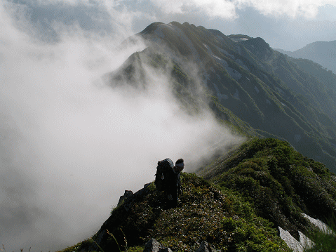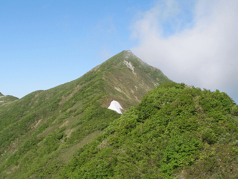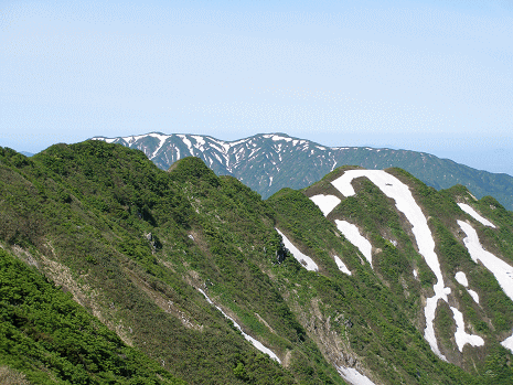 翌日は快晴。小屋を最後に跡にし、山頂に向う。360度の展望は鳥海山から越後三山、尾瀬までが一望できた。ハクサンイチゲの咲き乱れる稜線漫歩を楽しみながら、大石山に向う。昨日と違ってゆっくりとした行程だ。鉾立峰から今一度アゴク峰方面を見る。踏破した…ということで、懐かしさがこみ上げ、親しさが感じられた。