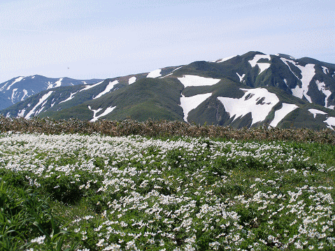 <ハクサンイチゲの群落と主稜線>