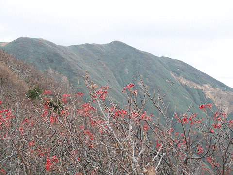 天気は前日の予報だと2日間とも晴れだったのだが、急に寒気が入ることになったらしい。夕方から雨の予報に変わっていた。冬型になっているのだろうか、休んでいると寒くなってくる。カモス峰あたりまでは紅葉がまだ盛りといった感じだが、標高が上がるにつれ晩秋〜初冬の風情になってくる。そのなかでナナカマドの赤い実が目立つ。