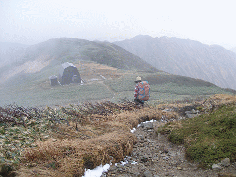前杁差岳からはガスの中に入り、雨交じりの風も強まってきていた。よく見ると、登山道の隅に雪が残っている。今年はなかなか寒くならなかったため今山行も雪のことなど全く頭になかったので、思いもかけない初雪到来となった。杁差岳山頂からの視界はゼロ。小屋に急ぎ、すぐに水汲みに出る。