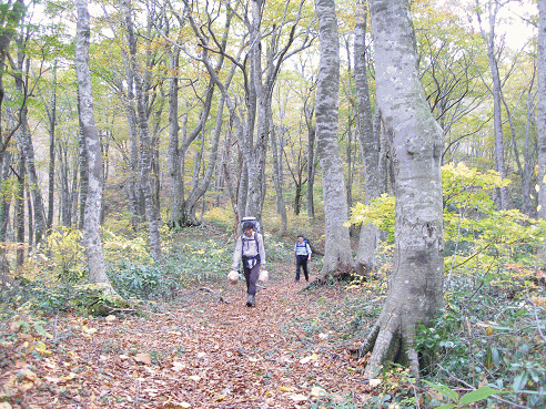 今回はコースタイムを書いた紙を失くしてしまい、大雑把なタイムしか残せなかった。月夜平のブナ林は紅葉真っ盛りで素晴らしいの一言。先行者が大分いるようなので、キノコはあきらめ状態だったが、倒木にナラタケがびっしり。今秋はナラタケの豊作年のようだ。翌日にすると誰かに採られるかもしれないというイヤらしい根性丸出しで、あらかた収穫し、袋を見えないところに置いてゆくことにした。