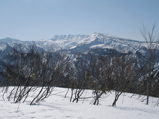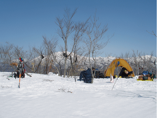 下りはクラスト箇所を注意して過ぎる。みな通過したあたりで「ガサ〜ッ」とか「ドサ〜ッ」という音を聞く。雪崩?いや違う、なんとメンバーのひとりが急斜面で外したワカンを肩にかけていて、それが落ちて斜面を滑っていってしまったという。もうひとりはヤブの中で腕時計をなくしたとも言っていた。もったいないが、どちらも探すすべもなく戻る。