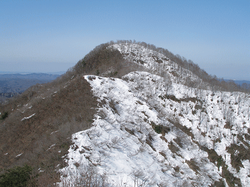 山頂からの主尾根の乗っかる手前の急斜面にはロープも張られている。そこから一登りで556.4mの蕗山山頂に着く。広い山頂は見事な展望だった。守門岳は真正面、川内山塊の矢筈岳から粟ケ岳までのパノラマも広がる。申し分のない大光景を楽しめる。