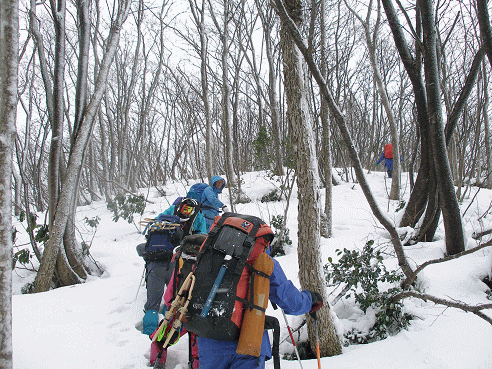 下りはワカンを外したのが大失敗。まだまだ深雪の山なのであって、足が潜って大変だった。上のガスも晴れず終い。立春といっても暦の上だけの春なんだよな。でも、厳冬期の雪山にはガスが似合っちゃうのである……。