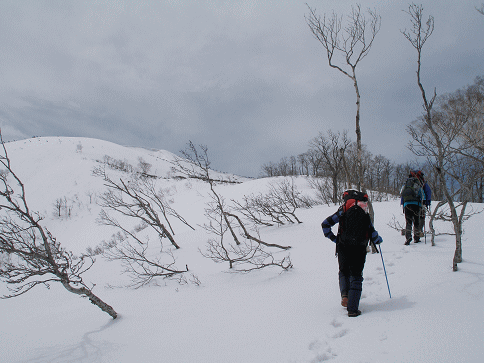 巽沢山直下で小休止。巽沢山を越え、少し登ったところから広いブナ林となり、1200mあたりから雪の上を歩くようになる。家向山のピークをトラバース気味に行き、1420mの鞍部でまた小休止。天気はというと、太陽は雲に隠されがちで、風も強く、肌寒く感じる。雪もまだクラスト気味なので、朝方はそうとう冷えたのだろう。