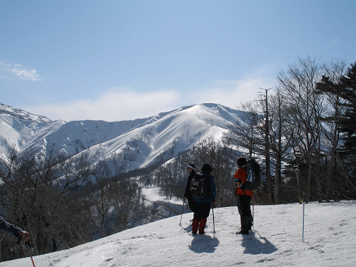 目指す窓明山はまだ遠くに見える。隣の三ツ岩岳の方が高いのだが、山頂まで針葉樹が密になっているので、ブナ林で山頂直下は白い一枚バーンになっている窓明山のほうがより輝いて見える。木が無くなり、200m弱の急斜面を登ると窓明山頂だった。雪がクラストしていたら…は杞憂に終わった。雪は適度以上に緩んでいた。