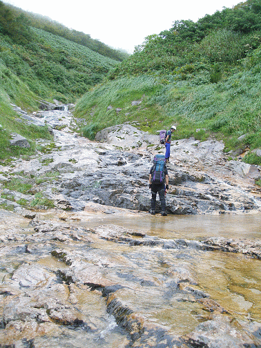 二股近くになってくると、傾斜も強くなってくる。天気もガス+霧雨となっていた。二股の右俣上に良いテン場があったが、私たちは右俣をつめ源頭の草地まで行く。沢が細くなり左に曲がるところの草原でテントを張ることにした。ザイルは使わず終い。天気も悪かったせいか、ナメ滝のスケール、深い釜の美しさがあまり伝わってこなかった、というのが実感だった。
