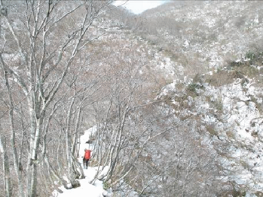 水場からは急登をラッセル!?しながら行く。ツボ足で15〜20cmももぐっただろうか。「思っていたよりも雪が少ないなあ」……だったらしい。雑木林を抜け笹ヤブになると山頂も近い。