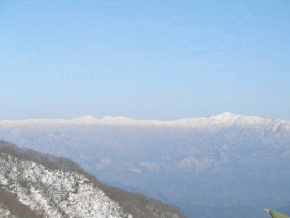 山頂は3、40cmくらいの積雪。冬の蒼い空が広がり、飯豊連峰がくっきりと浮き上がって見える。雪はどのあたりまで下りてきているのだろうか。ある一定の標高線から上が真っ白になっている。先週の大熊小屋に行ったあたりから大分雪が降ったのだろう。