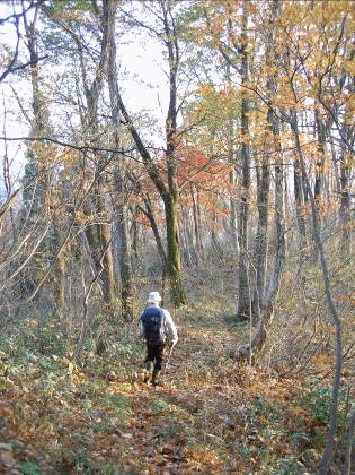 下も紅葉の盛りは過ぎていた。雪は400mあたりから出始め、水場のある480m付近はもう雪で覆われていた。五頭連峰もナラの立ち枯れが目立つ。ナメコ、クリタケ、ムキタケなどを収穫しながらゆっくりと登る。