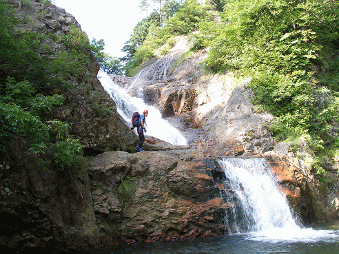 右岸にネコノ沢、左岸にホコガイ沢を確認しながらいくと、水量豊富な10m強の滝に出合う。垂直なのだが、右壁が階段状になっているので直登する。ここ数日は雨もなく水量が少ないのだろう…そう、今回はもっとも恵まれた遡行なのだろう。水の量で滝の登り方や釜の渡渉、壁のへつり方が変わってくるのは当然だ。この10m強の滝も水量が多ければ、もっとも大変な滝となるに違いない。