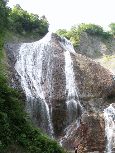 美しいナメ滝が続く。傾斜もほどよく、サラサラ!?とした流れの中を歩いていく感じだ。沢全体が赤茶けているのは鉱山があったということで、水はサビ臭くて飲めないそうだ。沢がカーブしたか…と思ったら、ドでかい滝が目の前に現れた。滑川大滝である。100mは超えるだろう滝だ。沢登りでこんなに大きな滝を目の前にしたことがないのではないか。見上げると水の飛沫がすごい。悠々と水が流れ落ちている。写真を撮るにしても、私のデジカメだと入りきらないほどだ。