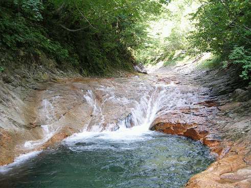 滑床と大釜、そして小滝が続く変化に富んだ美しい沢だった。流れる水の輝きと釜の深い色の素晴らしさを堪能できた。天気も良く、水量も少なくて最も恵まれた遡行だった。この沢は増水すると様相は一変するらしい…沢はみなそうなのだが……。自分たちの力量で行ける、このような美しい沢を選んで楽しみたいなあ。